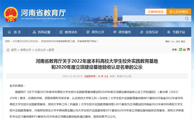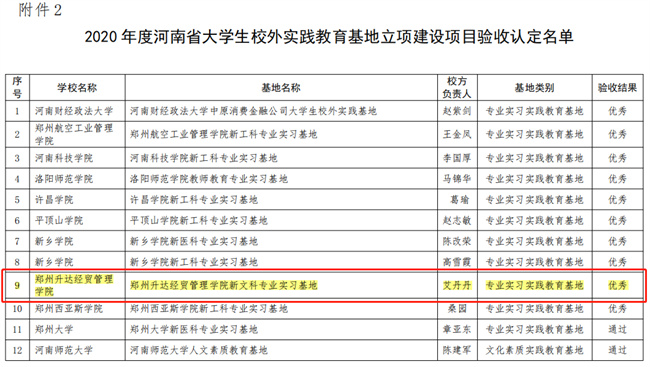 中新河南網(wǎng)11月18日電 近日,從河南省教育廳網(wǎng)站《河南省教育廳關(guān)于2022年度本科高校大學(xué)生校外實(shí)踐教育基地和2020年度立項(xiàng)建設(shè)基地驗(yàn)收認(rèn)定名單的公示》中獲悉,鄭州升達(dá)經(jīng)貿(mào)管理學(xué)院商學(xué)院“新文科專(zhuān)業(yè)實(shí)習(xí)基地”和創(chuàng)新創(chuàng)業(yè)教育學(xué)院“創(chuàng)新創(chuàng)業(yè)實(shí)踐基地”通過(guò)2020年度立項(xiàng)建設(shè)基地驗(yàn)收,其中商學(xué)院“新文科專(zhuān)業(yè)實(shí)習(xí)基地”被評(píng)為優(yōu)秀基地,此次全省共有10個(gè)基地被認(rèn)定為優(yōu)秀基地。另外該校藝術(shù)學(xué)院“新文科(藝術(shù)設(shè)計(jì))大學(xué)生校外實(shí)踐教育基地”、會(huì)計(jì)學(xué)院“院新文科(財(cái)務(wù)管理)大學(xué)生校外實(shí)踐教育基地”被直接認(rèn)定為河南省本科高校大學(xué)生校外實(shí)踐教育基地,信息工程學(xué)院“新工科(計(jì)算機(jī)類(lèi))大學(xué)生校外實(shí)踐教育基地”獲批河南省本科高校大學(xué)生校外實(shí)踐教育基地立項(xiàng)建設(shè)。