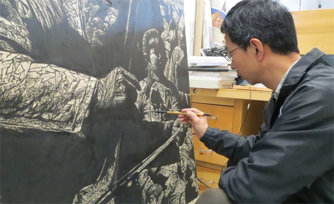 版畫不僅是個“腦力活”還是個“體力活”,每一次創(chuàng)作,對郝彥杰這樣的“熟手”來說,也是一次大挑戰(zhàn),“下刀的輕重、疏密都直接影響到版畫最終呈現(xiàn)的效果,馬街藝人系列,每一幅的創(chuàng)作過程都在一個學(xué)期左右。非?简?zāi)托暮图?xì)心。”
