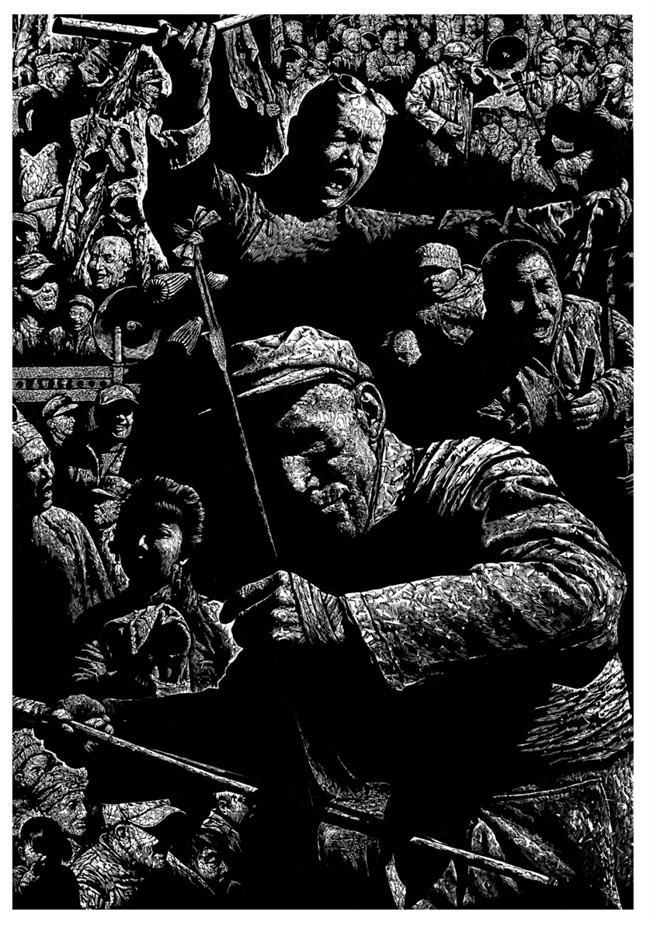 經(jīng)過反復(fù)推敲,2013年,郝彥杰的《應(yīng)河亮?xí)弧钒娈嬜髌窇?yīng)運而生,該作品采用黑白木刻,在一群人中重點刻畫了十多個表演者的形象,把書會的熱鬧、藝人們傾情獻藝的表演姿態(tài)、觀看者如癡如醉的神態(tài),刻畫的淋漓盡致。