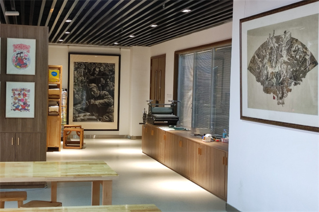 河南職業(yè)技術(shù)學(xué)院版畫與印刷體驗工作室(郝彥杰技能大師工作室),既是專業(yè)課程實訓(xùn)教學(xué)場所,又是版畫藝術(shù)展示空間,濃厚的藝術(shù)氣息撲面而來。“工作室建成于2017年底,是應(yīng)學(xué)院創(chuàng)新發(fā)展行動計劃整體規(guī)劃而建設(shè)的,既是版畫創(chuàng)作技藝傳承與現(xiàn)代藝術(shù)設(shè)計素養(yǎng)培養(yǎng)的教學(xué)基地,也承擔(dān)文化育人與技藝傳承的功能。”