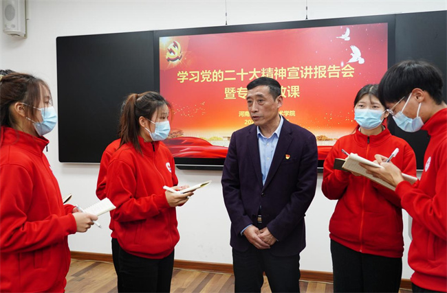 專題宣講“活起來(lái)”。學(xué)校黨委書記溫道軍、校長(zhǎng)王偉帶頭宣講黨的二十大精神,從黨的二十大的重大歷史意義、新時(shí)代十年的偉大變革、黨的二十大報(bào)告的創(chuàng)新理論、新時(shí)代職業(yè)教育發(fā)展目標(biāo)、如何做新時(shí)代的大先生和拔尖創(chuàng)新人才等方面,為廣大師生上專題思政課。深入淺出、內(nèi)涵豐富的闡述,精準(zhǔn)全面、暖心提氣的話語(yǔ),引導(dǎo)師生深刻領(lǐng)悟黨的二十大報(bào)告的理論含量、精神能量和實(shí)踐力量,進(jìn)而思考如何把黨的創(chuàng)新理論貫徹落實(shí)到推進(jìn)學(xué)校“十四五”規(guī)劃、統(tǒng)籌疫情防控和事業(yè)高質(zhì)量發(fā)展的各個(gè)方面,轉(zhuǎn)化為干事創(chuàng)業(yè)的實(shí)際成效,轉(zhuǎn)化為新征程上團(tuán)結(jié)奮斗、勇毅前行的實(shí)踐力量。學(xué)校領(lǐng)導(dǎo)、中層干部進(jìn)班級(jí)、進(jìn)課堂、進(jìn)科室,深入解讀二十大的重大意義和戰(zhàn)略部署,用事實(shí)說(shuō)話、用典型說(shuō)話、用數(shù)字說(shuō)話,把道理說(shuō)清楚,把報(bào)告講透徹,凝聚謀發(fā)展、共出彩、創(chuàng)未來(lái)的思想共識(shí)。