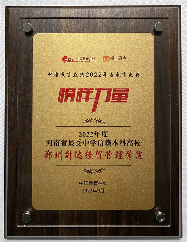 活動經過前期征集、專家會審、綜合評審等階段,鄭州升達經貿管理學院從全國眾多高校中脫穎而出,獲得 “2022年度河南省最受中學信賴本科高校”獎項。這充分體現(xiàn)了學校辦學成果得到了社會的廣泛認可和高度好評。