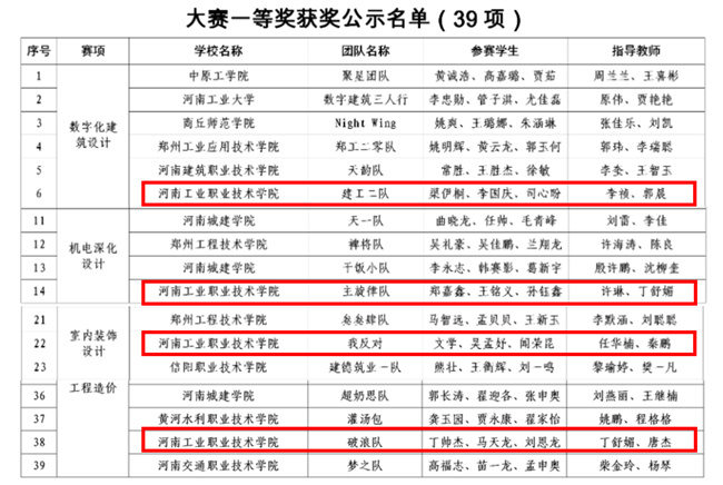 該校建筑工程學(xué)院參賽隊(duì)與眾多本科院校同臺(tái)競技,斬獲佳績,獲得數(shù)字化建筑設(shè)計(jì)一等獎(jiǎng)1項(xiàng)、二等獎(jiǎng)1項(xiàng),機(jī)電深化設(shè)計(jì)一等獎(jiǎng)1項(xiàng),室內(nèi)裝飾設(shè)計(jì)一等獎(jiǎng)1項(xiàng)、二等獎(jiǎng)1項(xiàng),工程造價(jià)一等獎(jiǎng)1項(xiàng)、二等獎(jiǎng)1項(xiàng),工程管理二等獎(jiǎng)2項(xiàng),數(shù)字化結(jié)構(gòu)設(shè)計(jì)三等獎(jiǎng)1項(xiàng)。同時(shí),該校還獲得優(yōu)秀組織獎(jiǎng)。