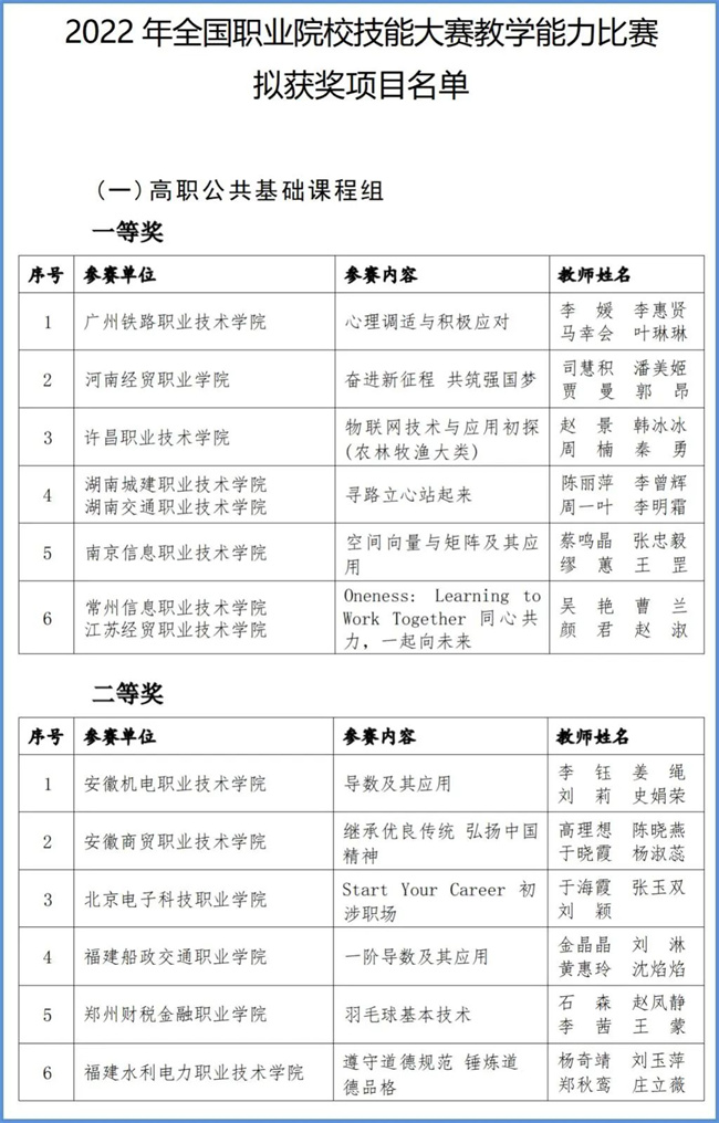 高職公共基礎(chǔ)組獲獎(jiǎng)名單(部分)