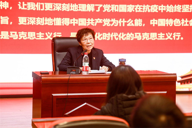 王霄鸝從在疫情面前我們做了些什么、抗疫這場大考彰顯了什么、作為新時(shí)代的青年我們應(yīng)該怎么做三個(gè)方面為同學(xué)們梳理總結(jié)了這三年來我們經(jīng)歷的這場驚心動魄、艱苦卓絕的世紀(jì)大考。