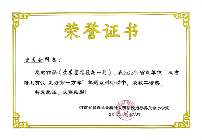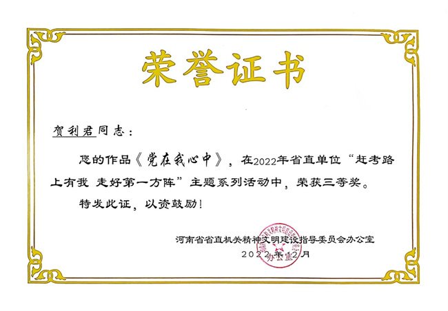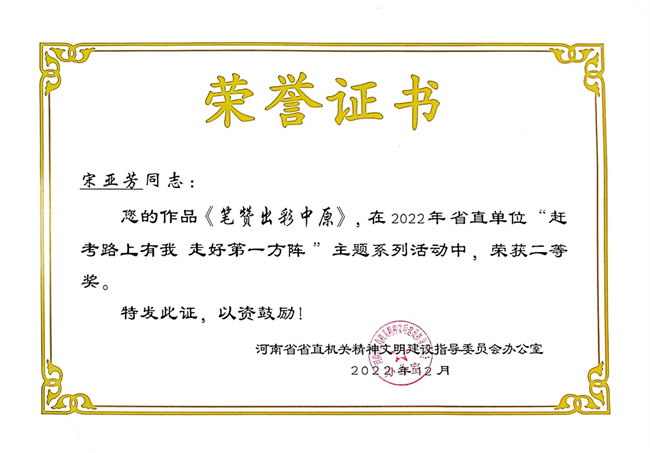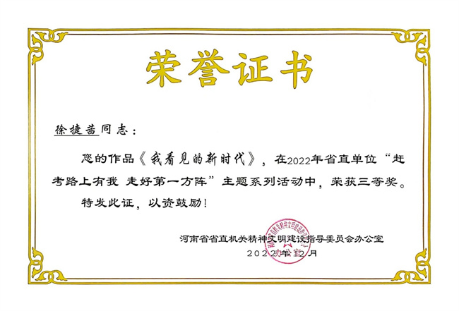 中新河南網(wǎng)3月1日電(鄭宇) 近日,省直文明辦印發(fā)《關(guān)于省直單位“趕考路上有我 走好第一方陣”主題系列活動(dòng)的表揚(yáng)通報(bào)》,鄭州電力高等?茖W(xué)校報(bào)送的作品《錄芳堅(jiān)館題跋一則》(曹秀會(huì))獲書法類二等獎(jiǎng);《筆贊出彩中原》(宋亞芳)獲征文類二等獎(jiǎng);《我看見的新時(shí)代》(徐捷茜)、《黨在我心中》(賀利君)獲繪畫類三等獎(jiǎng)。