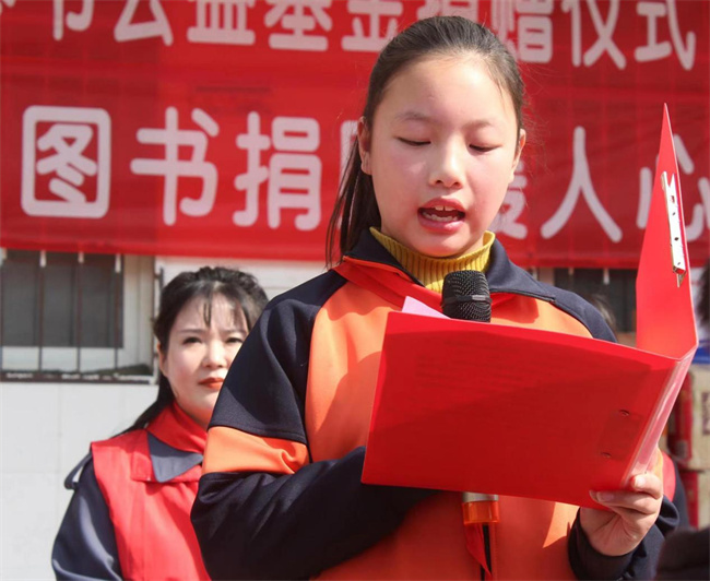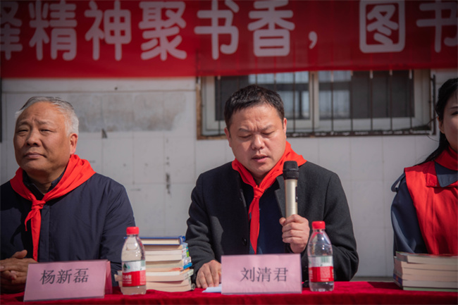 圖書捐贈儀式在同學(xué)們?yōu)轭I(lǐng)導(dǎo)及老師們敬獻(xiàn)紅領(lǐng)巾、齊唱《學(xué)習(xí)雷鋒好榜樣》中拉開序幕,而后由應(yīng)舉鎮(zhèn)黨委副書記劉清君、一本書公益基金會代表張盈棣、商貿(mào)系學(xué)團(tuán)辦負(fù)責(zé)人王婧先后發(fā)表重要講話,領(lǐng)導(dǎo)、老師們紛紛囑托東大村的孩子們好好利用圖書資源,努力學(xué)習(xí),成為黨和國家的棟梁之才,長大以后用實(shí)際行動報(bào)效祖國。隨后,學(xué)生代表向各位領(lǐng)導(dǎo)及老師們表達(dá)誠摯的謝意,表示定當(dāng)不負(fù)眾望,努力學(xué)習(xí),將來擔(dān)當(dāng)起建設(shè)祖國的重任。