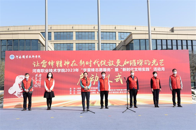 中新河南網(wǎng)3月7日電(胡艷王宜賓) 惠風(fēng)和暢,陽光明媚。今年3月5日,是第60個“學(xué)雷鋒紀(jì)念日”。當(dāng)天上午,河南職院隆重舉行2023年“學(xué)雷鋒志愿服務(wù)”暨“新時代文明實(shí)踐”活動月啟動儀式。校長梅樂堂出席儀式并作題為《讓雷鋒精神在新時代綻放更加璀璨的光芒》的“開學(xué)第一課”講話。龍子湖辦事處黨工委副書記、主任李鄭懿出席儀式并致辭。儀式由校黨委副書記、紀(jì)委書記田華主持。