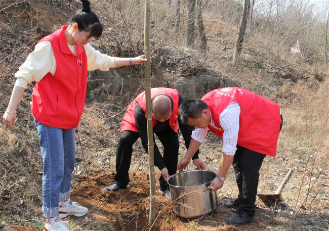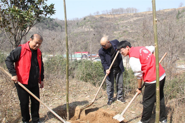 到達植樹地點后,新密市莪溝村駐村書記劉子印、商貿系黨支部副書記劉晉帶領老師、志愿者拿著鏟子上山挖坑,開始了植樹準備工作。與此同時,村民們現場教其他志愿者怎樣植樹,每個志愿者都認真聽講并積極實踐;顒蝇F場,大家都干勁十足,積極認領“責任樹”,兩人一組,迅速投入到植樹活動中,揮鍬挖坑、扶樹填土、提水澆樹,相互協作、配合默契,每一道工序都做得一絲不茍,現場充滿了團結協作、奮發(fā)向上的融洽氛圍,真正展現了青年學子奮發(fā)向上的精神風貌。經過2個多小時的揮汗奮戰(zhàn),一棵棵樹苗迎風挺立,為早春增添新綠,鄭州財稅金融職業(yè)學院“小蜜蜂”志愿者喬冠宇說:“通過本次志愿植樹活動,豐富了我們的課外實踐活動的同時,也讓我們感受到了志愿服務的快樂,希望更多的同學們能參與生態(tài)環(huán)境志愿服務活動,以己之力踐行志愿精神、保護生態(tài)環(huán)境!”