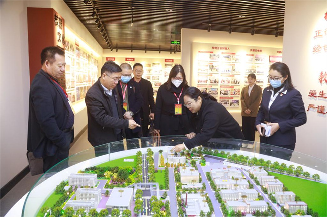 聽課結束后,專家組一行前往思政演練中心,考察該院思政課實踐教學建設情況,通過VR一體機沉浸式交互體驗紅色思政教學。隨后,專家組前往該院校內實踐基地校史館參觀,在教務處副處長周艷麗的講解下,全方位了解了該院55年來的發(fā)展歷程、辦學成就、發(fā)展規(guī)劃和學生實踐成果。