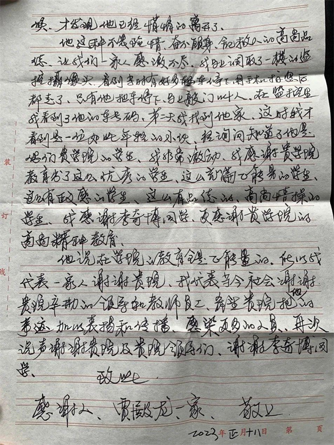 火越燒越旺,李奇博同學(xué)讓自己冷靜下來,首先將易燃易爆物品轉(zhuǎn)移,尋找身邊可以用的滅火工具,看到了二樓的蓄水罐,引水!李奇博同學(xué)急中生智,用二樓的蓄水罐,提水滅火,一趟又一趟地提水滅火。濃煙彌漫了所有人的眼和臉,大家還在奮力滅火,但火勢還是未能得到控制,慢慢的,呼吸的急促聲,咳嗽聲和劈劈啪啪的炙烤聲混成了一片,很是作響。但是李奇博和著火的那一家居民依舊沒有放棄,不停的撲火,提水,經(jīng)過長時間的奮戰(zhàn),幫賈殿龍一家撲滅了大火,之后就默默離開了。事后,賈殿龍一家通過各種途徑找到了李奇博同學(xué)表達(dá)謝意但是被他婉拒了,后來賈殿龍一家在鄰居口中得知李奇博同學(xué)是周口職業(yè)技術(shù)學(xué)院學(xué)生,并以寫感謝信的形式再次向?qū)W校、向李奇博同學(xué)表達(dá)感謝!