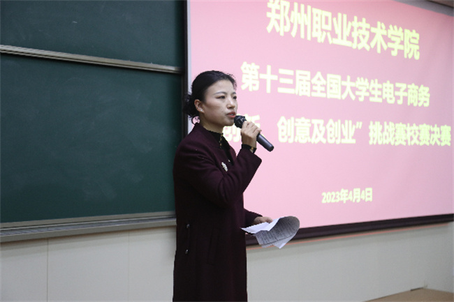 本次大賽邀請了學(xué)校招生就業(yè)服務(wù)中心主任蔡紅、電子商務(wù)學(xué)院書記張慧珠、電子商務(wù)學(xué)院院長周文超、全球(鄭州)跨境電商研究院特聘教授張文勇、電子商務(wù)學(xué)院任方軍教授和楊中昭教授等人出席。同時邀請到了河南省高校雙創(chuàng)工作負(fù)責(zé)人楊馮圓教授、教育部優(yōu)秀創(chuàng)新創(chuàng)業(yè)導(dǎo)師岳亮、天明集團(tuán)健康板塊副總經(jīng)理王杰和鄭州水工機械有限公司生產(chǎn)運維部經(jīng)理韓錦鐸等校外專家蒞臨評審和指導(dǎo)。