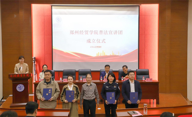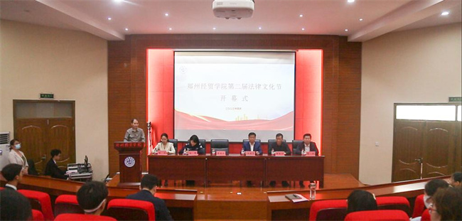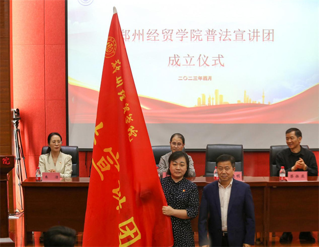 校長(zhǎng)助理?xiàng)畹旅飨蜞嵵萁?jīng)貿(mào)學(xué)院普法宣講團(tuán)團(tuán)長(zhǎng)授旗,并宣布鄭州經(jīng)貿(mào)學(xué)院第二屆法律文化節(jié)開(kāi)幕。