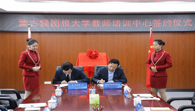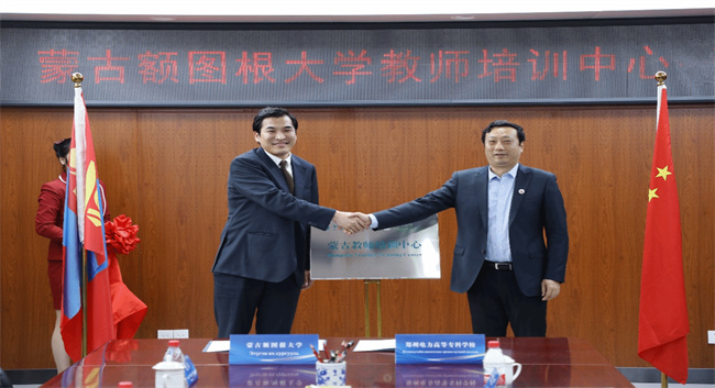 會(huì)上,楊小琨副校長進(jìn)行了熱情洋溢的致辭,從悠久深厚的歷史底蘊(yùn)、特色鮮明的行業(yè)辦學(xué)、設(shè)施完善的教學(xué)硬件、質(zhì)效雙高的職業(yè)培訓(xùn)和創(chuàng)新模式的國際交流5個(gè)方面簡潔、全面地對(duì)鄭州電力高等專科學(xué)校進(jìn)行了介紹,并表示在未來的合作中聚焦高質(zhì)量發(fā)展,持續(xù)深化人文交流與教育合作。蒙古額圖根大學(xué)副校長艾德賽汗(Nyamzagd IDERSAIHAN)表示蒙古額圖根大學(xué)于2001年建校后快速發(fā)展,作為蒙古重點(diǎn)大學(xué),曾獲得“蒙古最好環(huán)境學(xué)校”稱號(hào);擁有醫(yī)學(xué)、護(hù)理學(xué)、商學(xué)、會(huì)計(jì)學(xué)等24個(gè)本科專業(yè),同時(shí)建立的還有碩士和博士培養(yǎng)點(diǎn);大學(xué)始終秉承為社會(huì)培養(yǎng)有能力、有思想、有責(zé)任感的復(fù)合型人才的宗旨,深耕于高質(zhì)量高等教育教育二十余載,希望此次簽約可以與中國在學(xué)術(shù)、技術(shù)和人文方面有更深、更長遠(yuǎn)的合作。隨后雙方簽訂合作備忘錄并共同為“蒙古教師培訓(xùn)中心”揭牌。