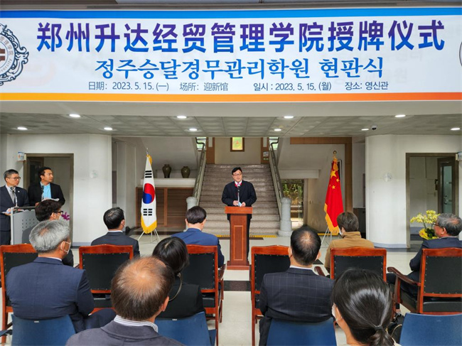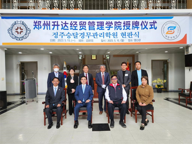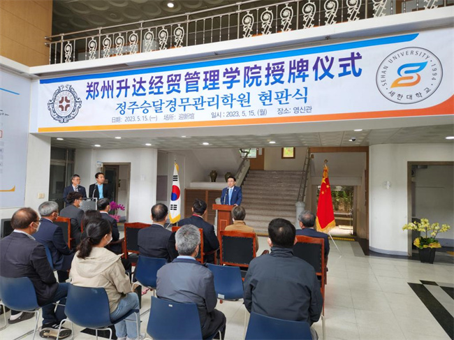 中新河南網(wǎng)5月25日電(崔東麗) 5月15日至16日,鄭州升達(dá)經(jīng)貿(mào)管理學(xué)院執(zhí)行董事王新奇率團(tuán)赴韓國(guó)世翰大學(xué)參訪交流。5月15日上午,該校與韓國(guó)世翰大學(xué)互設(shè)分院簽約儀式暨世翰大學(xué)升達(dá)分院揭牌儀式在世翰大學(xué)成功舉行。學(xué)校執(zhí)行董事王新奇、實(shí)訓(xùn)管理處處長(zhǎng)程敏姿,韓國(guó)世翰大學(xué)校長(zhǎng)李昇勛、副校長(zhǎng)楊福莞、國(guó)際交流院院長(zhǎng)沈載淵、教育支援處處長(zhǎng)金成哲、韓國(guó)語(yǔ)學(xué)堂長(zhǎng)安鐘淇、外事處長(zhǎng)孫多玉出席揭牌儀式。