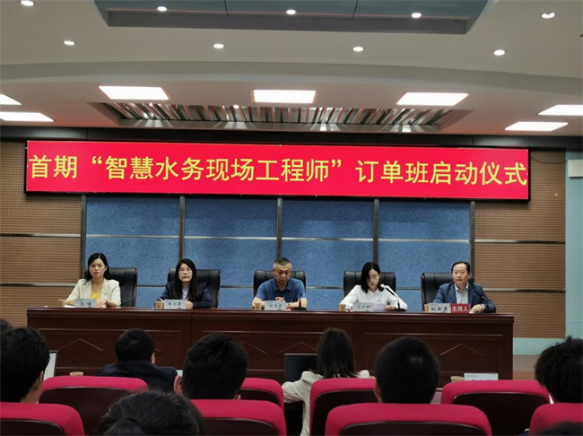 劉玉賓在致辭中指出,本次訂單班是深入貫徹落實(shí)黨的二十大精神,推進(jìn)職普融通、產(chǎn)教融合、科教融匯,加快生態(tài)環(huán)境類(lèi)高素質(zhì)現(xiàn)場(chǎng)工程師的培養(yǎng),促進(jìn)教育鏈、人才鏈、產(chǎn)業(yè)鏈與創(chuàng)新鏈的有機(jī)銜接的重要體現(xiàn),是該校全面實(shí)踐中國(guó)特色學(xué)徒制,健全校企協(xié)同發(fā)展新機(jī)制,形成技術(shù)技能人才緊缺領(lǐng)域系統(tǒng)儲(chǔ)能、賦能的環(huán)境保護(hù)人才培養(yǎng)培訓(xùn)生態(tài)的重要舉措。學(xué)校將根據(jù)校企合作協(xié)議及訂單培養(yǎng)協(xié)議的要求,并堅(jiān)持以推動(dòng)就業(yè)為導(dǎo)向,以服務(wù)學(xué)生為宗旨,以實(shí)現(xiàn)零距離就業(yè)為目標(biāo),堅(jiān)持有利于學(xué)生、企業(yè)、學(xué)校三方發(fā)展,促進(jìn)校企互利合作、資源共享,促進(jìn)教學(xué)相長(zhǎng),做好學(xué)生的教育、管理工作,使訂單學(xué)生盡快實(shí)現(xiàn)由學(xué)生向訂單企業(yè)員工身份的轉(zhuǎn)變,全面提高學(xué)生的綜合素質(zhì)和職業(yè)能力。希望借此契機(jī),把訂單班辦出特色來(lái)、辦出成績(jī)來(lái);希望訂單班同學(xué)們好好學(xué)習(xí),拼搏向上,為生態(tài)環(huán)境保護(hù)行業(yè)輸送優(yōu)質(zhì)的智慧水務(wù)領(lǐng)域創(chuàng)新型、復(fù)合型人才。