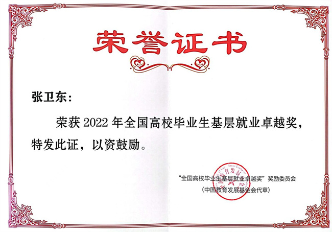 “全國(guó)高校畢業(yè)生基層就業(yè)卓越獎(jiǎng)”由教育部高校學(xué)生司、教育部學(xué)生服務(wù)與素質(zhì)發(fā)展中心共同指導(dǎo),中國(guó)長(zhǎng)江三峽集團(tuán)出資,中國(guó)教育發(fā)展基金會(huì)設(shè)立;旨在獎(jiǎng)勵(lì)普通高校赴基層就業(yè)并做出突出業(yè)績(jī)的畢業(yè)生和指導(dǎo)服務(wù)大學(xué)生赴基層就業(yè)工作有突出貢獻(xiàn)的教師。2023年1月,教育部部署各地各高校開(kāi)展“全國(guó)高校畢業(yè)生基層就業(yè)卓越獎(jiǎng)”推薦活動(dòng),經(jīng)各省(市、自治區(qū))評(píng)選推薦,從全國(guó)2700余所普通高校中確定獎(jiǎng)勵(lì)畢業(yè)生398人、教師60人。