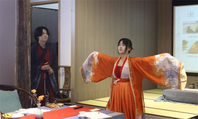 茶小仙芳芳習(xí)茶不久,雖然步驟已經(jīng)爛熟于胸,沒有公開展示的歷練,當(dāng)茶藝總監(jiān)臨時(shí)缺席,毫不猶豫勇敢補(bǔ)位,敏捷地?fù)Q上短衫、襦裙,同學(xué)們跑過來幫助穿衣結(jié)帶,迅速整理停當(dāng),登臺(tái)表演。聚光燈照耀下的唐裝茶小仙萌萌的,清新可喜,吸引與會(huì)者高舉手機(jī)錄視頻、拍照。今天,將出現(xiàn)在很多人的朋友圈,煎茶技藝的傳承又前進(jìn)了一步。