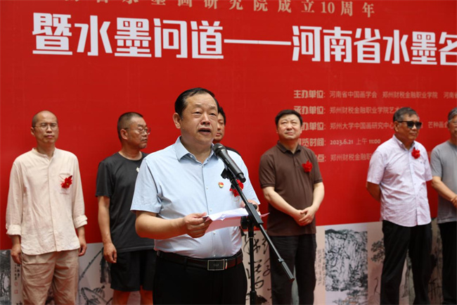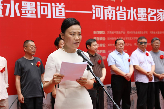 鄭州財稅金融職業(yè)學(xué)院院長程慎為畫展開幕式致辭,他表示:學(xué)校近年來開展了豐富多彩的藝術(shù)教育實踐活動,在公共藝術(shù)教育工作中取得了顯著的成績。水墨問道畫展的舉辦是學(xué)校“高雅藝術(shù)進(jìn)校園”的一項美育教育實踐活動。美育使人的情感得到陶冶、思想得到凈化、品格得到完善,從而使身心得到和諧發(fā)展,精神境界得到升華,自身得到美化。要用馬克思主義的審美觀教育學(xué)生,培養(yǎng)學(xué)生正確的審美理想、健康的審美情趣,提高對美的感受力、鑒賞力、表現(xiàn)力和創(chuàng)造力。以美引善,提高學(xué)生的思想品德;以美啟真,增強(qiáng)學(xué)生的智力;以美怡情,增進(jìn)學(xué)生的身心健康。