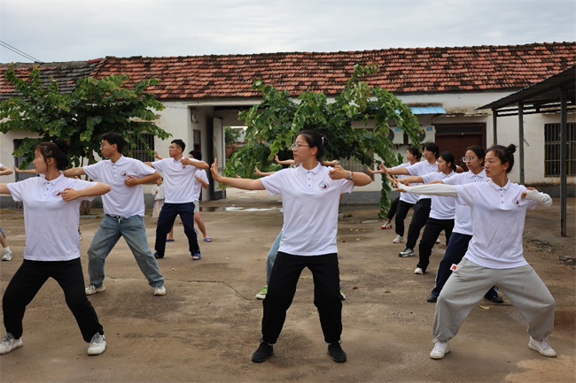 訓(xùn)練有素,神采奕奕展風(fēng)貌。“三下鄉(xiāng)”社會實踐不僅是一個為民辛勤奉獻的過程,也是青年學(xué)生自我成長的過程。每天早上7點,服務(wù)團志愿者們以一套整齊劃一的八段錦喚醒頭腦;中午12點,老師和同學(xué)們一起盛飯,師生一心,勞動筑基;晚上8點,志愿者們跳團舞來放松身體,強壯體魄;晚上8點半,老師帶領(lǐng)召開工作會議,進行一天工作的查漏補缺及分析總結(jié)。從一日三餐到洗漱住宿,是自律的作息,是團隊的力量,是每名志愿者的堅守,從而保證服務(wù)團志愿者們以訓(xùn)練有素的精神風(fēng)貌展現(xiàn)河中醫(yī)青年學(xué)子的實踐風(fēng)采。