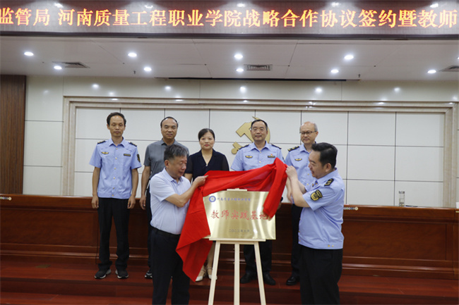 在儀式現(xiàn)場,邱紅標和孫國權共同為“河南質(zhì)量工程職業(yè)學院教師實踐基地”揭牌。葛長龍、劉宏偉分別代表雙方簽訂戰(zhàn)略合作協(xié)議。