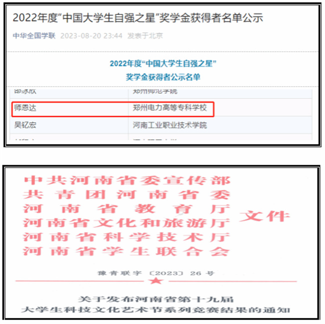 學(xué)校電氣工程學(xué)院師恩達(dá)同學(xué)獲得“2022年度中國(guó)大學(xué)生自強(qiáng)之星”榮譽(yù)稱號(hào);學(xué)校獲得河南省第十九屆大學(xué)生科技文化藝術(shù)節(jié)歌手大賽三等獎(jiǎng)一項(xiàng)(指導(dǎo)老師:劉遠(yuǎn))、舞蹈大賽優(yōu)秀獎(jiǎng)一項(xiàng)(指導(dǎo)老師:張揚(yáng)揚(yáng))、主持人大賽優(yōu)秀獎(jiǎng)一項(xiàng)(指導(dǎo)老師:田佳瑛、李莎莎);學(xué)校獲得河南省第五屆中華經(jīng)典誦寫講大賽經(jīng)典誦讀作品大賽三等獎(jiǎng)二項(xiàng)(指導(dǎo)老師:田佳瑛)。