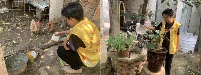 幫助低保戶村民喂雞吃食、澆花