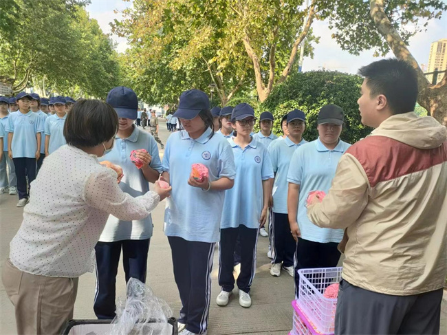 一個個蘋果、橘子發(fā)放到同學們手中,酸酸甜甜的味道驅離了軍訓的疲憊。“啊,謝謝老師!”“實在是出乎意料,沒想到學校會以這樣的方式慰問我們,原來我們學校也是‘別人家的學校’!”剛領到水果的新生笑著說。