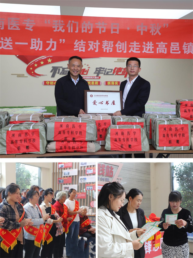 河南醫(yī)專積極關(guān)注鄉(xiāng)村書屋建設(shè),向高邑鎮(zhèn)孫橋村新時代文明實踐所捐贈圖書1000余冊,用愛心助力鄉(xiāng)村文化繁榮發(fā)展,為孫橋村營造濃郁的讀書氛圍,進(jìn)一步豐富村民精神文化生活;顒蝇F(xiàn)場,還設(shè)置了醫(yī)療服務(wù)咨詢處,并結(jié)合秋冬季節(jié)常見病對群眾進(jìn)行預(yù)防宣傳。黨員干部為群眾送上了節(jié)日福餅,在表達(dá)中秋節(jié)日美好祝愿的同時,切實解決群眾困難,有效提高群眾的健康意識,逐步養(yǎng)成文明健康的生活方式,營造和諧健康的鄉(xiāng)風(fēng)家風(fēng)。
