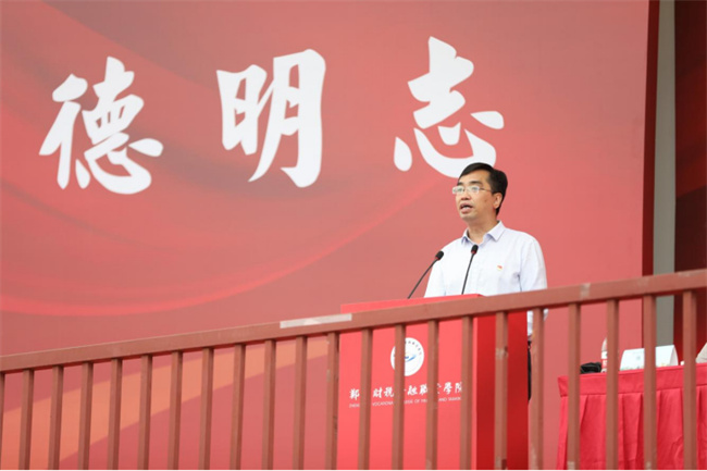 最后,院長(zhǎng)李曉東作開學(xué)致辭。李院長(zhǎng)代表學(xué)校向全體新同學(xué)表示熱烈歡迎和衷心的祝賀,同時(shí)以《匠心筑夢(mèng),篤行致遠(yuǎn)》為題對(duì)鄭財(cái)院學(xué)子提出殷切希望:一是希望同學(xué)們正德明志,爭(zhēng)做堪當(dāng)大任的時(shí)代新人;二是希望同學(xué)們求知篤行,爭(zhēng)做勤奮好學(xué)的學(xué)習(xí)達(dá)人;三是希望同學(xué)們經(jīng)世致用,爭(zhēng)做本領(lǐng)過硬的匠師能人;四是希望同學(xué)們熱愛生活,爭(zhēng)做全面發(fā)展的優(yōu)秀全人。立德立志,久久為功,李院長(zhǎng)表示,學(xué)院和全體教師將全力以赴培養(yǎng)同學(xué)們成人成才,讓每一位鄭財(cái)院學(xué)子都堅(jiān)定信念感悟家國(guó)情懷、創(chuàng)新實(shí)干書寫奮斗人生、勇?lián)姑`行青春誓言,努力成長(zhǎng)為有理想、敢擔(dān)當(dāng)、能吃苦、肯奮斗的新時(shí)代好青年!