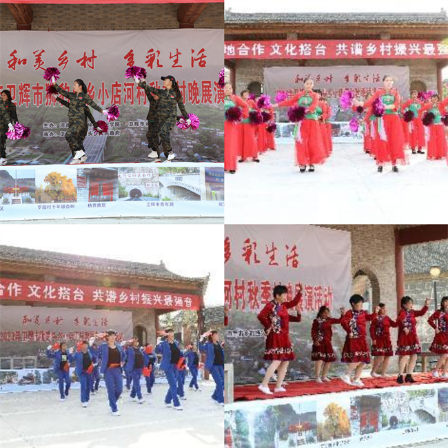 衛(wèi)輝市獅豹頭鄉(xiāng)小店河村、砂掌村、后龍臥村、羅圈村、前龍臥村、白寺村等文藝團(tuán)隊(duì)相繼表演了舞蹈《開門紅》、廣場(chǎng)舞《祝福祖國》《五星紅旗迎風(fēng)飄揚(yáng)》《喜樂年華》《中國紅》《中國美》《多少次想起你》《今天是你的生日我的中國》、腰鼓《火火的中國、火火的時(shí)代》、手花舞《紅歌聯(lián)唱》、戲曲《王山要飯》等節(jié)目。