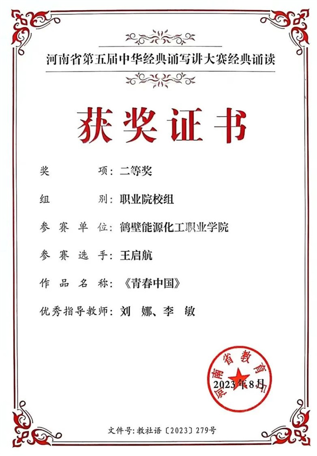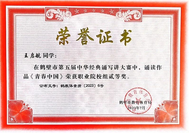 在省級評選中,該校高職2021級嬰幼兒托育服務(wù)與管理班的王啟航同學(xué)的作品《青春中國》獲河南省第五屆中華經(jīng)典誦寫講大賽經(jīng)典誦讀職業(yè)院校組二等獎,劉娜、李敏老師獲“優(yōu)秀指導(dǎo)老師”。