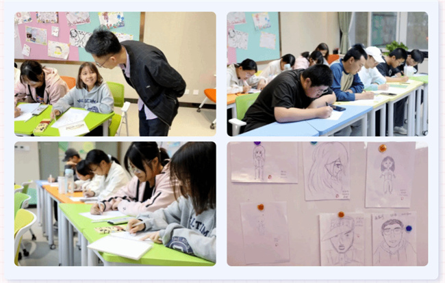 在繪畫的過程中,同學們一邊認真描繪自己的外貌特征,一邊和老師溝通自己的想法。當同學們作畫完畢后,老師對了每一幅作品進行了點評,通過色彩的選擇、線條的運用、形狀的構(gòu)建等,分析同學們的內(nèi)心世界和感受。