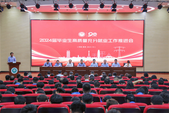 中新河南網(wǎng)10月28日電(阿依古麗·艾力江) 榮耀九秩,沐光而行續(xù)長(zhǎng)歌;展望百年,暉光日新向未來。為全面落實(shí)黨中央、國(guó)務(wù)院和省委、省政府“穩(wěn)就業(yè)”“保就業(yè)”的決策部署,扎實(shí)推進(jìn)鄭州電力高等專科學(xué)校建校90周年高質(zhì)量發(fā)展大會(huì)目標(biāo)愿景落實(shí)落地,10月24 日學(xué)校召開了2024 屆畢業(yè)生高質(zhì)量充分就業(yè)工作推進(jìn)會(huì)。學(xué)校黨委書記楊義波、校長(zhǎng)楊建華等校領(lǐng)導(dǎo)班子成員,招生就業(yè)處、教務(wù)處、學(xué)生處、團(tuán)委、保衛(wèi)處等相關(guān)職能部門負(fù)責(zé)人,學(xué)院總支書記、院長(zhǎng)、專業(yè)建設(shè)負(fù)責(zé)人、全體輔導(dǎo)員、畢業(yè)班班主任及大三、大二學(xué)生代表500余人參加會(huì)議,會(huì)議由副校長(zhǎng)黃鵬主持。