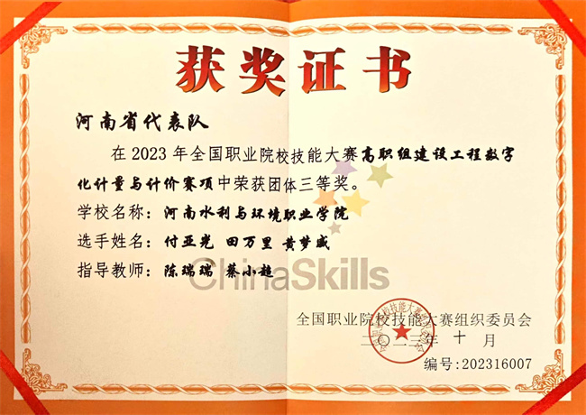 2023年,河南水利與環(huán)境職業(yè)學(xué)院各參賽隊伍代表河南省參加全國職業(yè)院校技能大賽,斬獲團(tuán)體一等獎2項、團(tuán)體三等獎2項。其中,在地理空間信息采集與處理賽項中,河南水利與環(huán)境職業(yè)學(xué)院已是四獲一等獎;在新增賽項水利工程BIM建模與應(yīng)用賽項中,學(xué)校首次參加國賽獲得一等獎;在建筑工程識圖賽項和建設(shè)工程數(shù)字化計量與計價賽項中,學(xué)校都實現(xiàn)了獎項突破,充分展現(xiàn)了學(xué)校的綜合辦學(xué)實力和良好育人成績,是多年來學(xué)校堅持“質(zhì)量優(yōu)先、內(nèi)涵發(fā)展”戰(zhàn)略的集中體現(xiàn)。