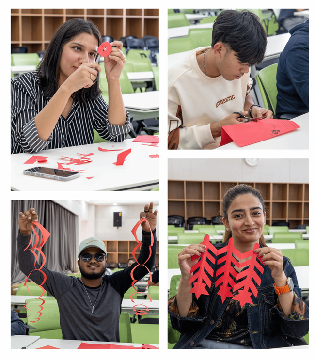在參與的過(guò)程中,留學(xué)生們互相交流、分享彼此的成果。大家一起討論如何提高剪紙技巧,以及如何將這項(xiàng)技藝與自己的文化相結(jié)合。通過(guò)這樣的互動(dòng),他們不僅感受到了剪紙藝術(shù)的美妙,學(xué)到了剪紙的方法,還進(jìn)一步了解了中國(guó)傳統(tǒng)文化的豐富與多樣性,體驗(yàn)到了絕妙精湛的傳統(tǒng)民俗手工藝術(shù)。