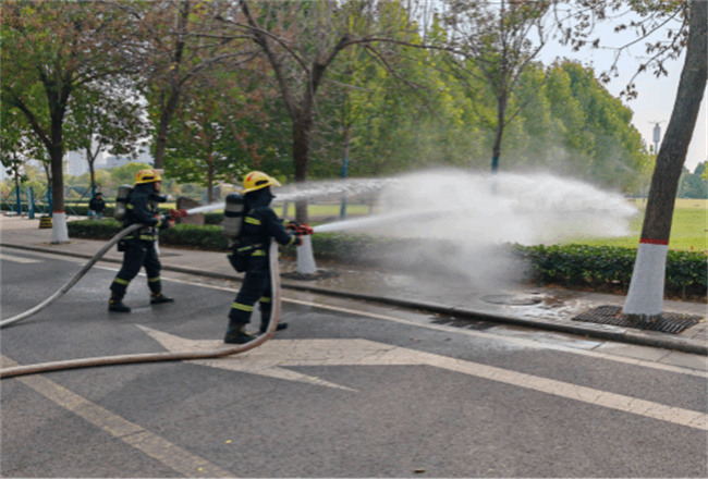 演練前,消防員首先對(duì)食堂餐飲服務(wù)人員、物業(yè)服務(wù)人員、校衛(wèi)隊(duì)員等一線值班員進(jìn)行了滅火器、滅火毯、過(guò)濾式消防自救呼吸器、消防水帶等消防設(shè)施的使用方法和日常工作、生活中應(yīng)知應(yīng)會(huì)的消防安全知識(shí)培訓(xùn),并展示了消防水槍、消防服等消防設(shè)施的功能。