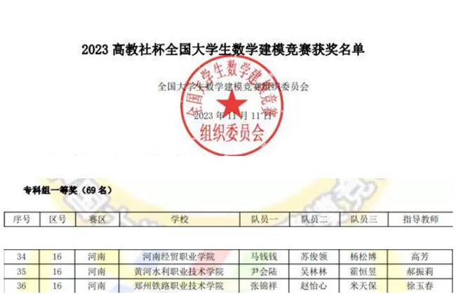 中新河南網(wǎng)11月17日電 近日,“高教社杯”全國大學生數(shù)學建模競賽成績發(fā)布,由黃河水利職業(yè)技術(shù)學院基礎部郝振莉老師指導的2021級水工建筑專業(yè)尹會陸、水文地質(zhì)專業(yè)吳林林和水利施工專業(yè)霍恒昱組成的參賽隊伍,獲得全國一等獎。