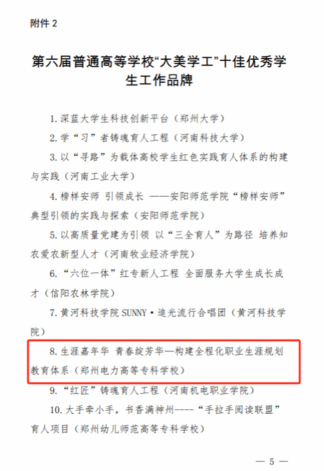中新河南網(wǎng)11月28日電(王家琪) 近日,河南省第六屆普通高等學(xué)校“大美學(xué)工”評(píng)選結(jié)果公示,鄭州電力高等?茖W(xué)校申報(bào)的“生涯嘉年華 青春綻芳華—構(gòu)建全程化職業(yè)生涯規(guī)劃教育體系”獲評(píng)十佳學(xué)生工作品牌。“大美學(xué)工”由河南省教育廳組織評(píng)選,經(jīng)過網(wǎng)絡(luò)評(píng)審、專家評(píng)議、現(xiàn)場(chǎng)展示、專家終審等環(huán)節(jié),此次是鄭州電力高等專科學(xué)校繼2021年連續(xù)第二次獲此殊榮。