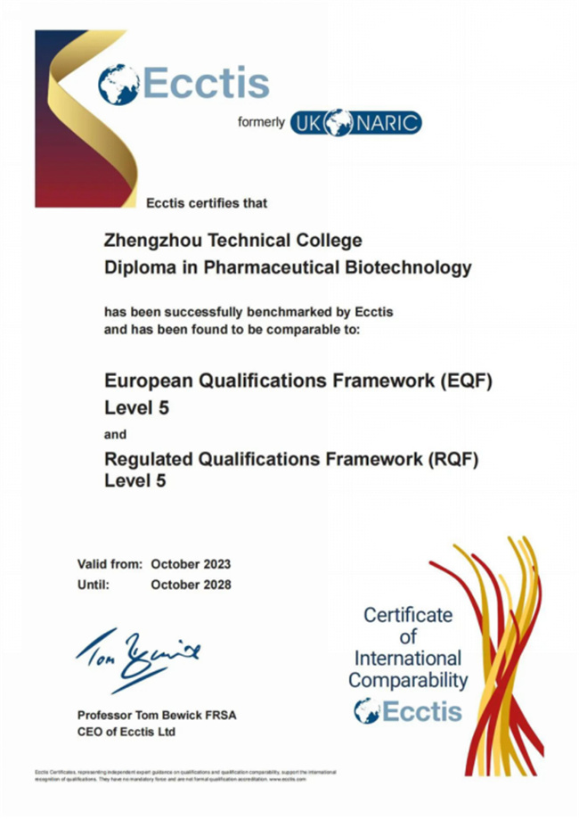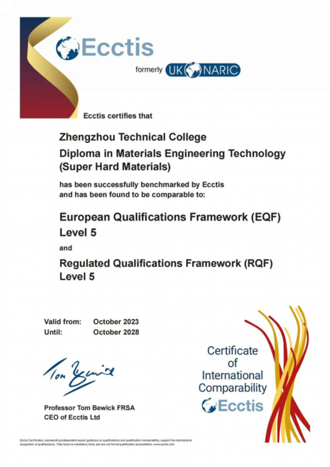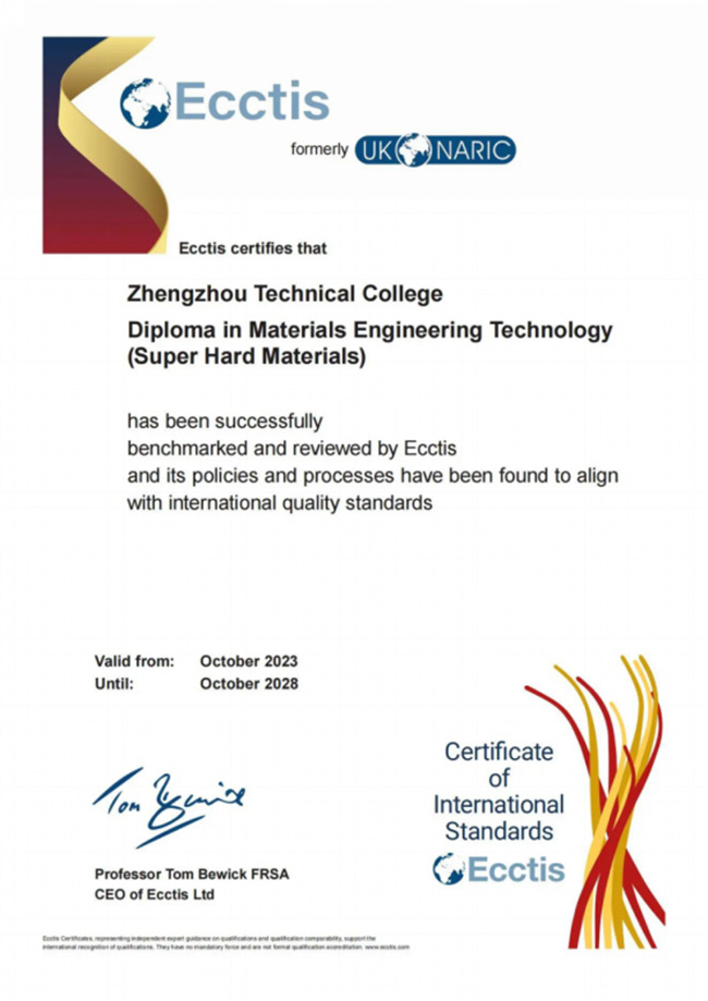 中新河南網(wǎng)12月6日電 近日,經(jīng)過兩年多的論證,鄭州職業(yè)技術(shù)學(xué)院藥品生物技術(shù)專業(yè)、材料工程技術(shù)專業(yè)(超硬材料方向)正式通過英國(guó)國(guó)家學(xué)歷學(xué)位評(píng)估認(rèn)證中心國(guó)際專業(yè)標(biāo)準(zhǔn)評(píng)估認(rèn)證,專業(yè)達(dá)到了英國(guó)資歷框架(RQF)和歐洲資歷框架(EQF)5級(jí)水平,順利取得國(guó)際可比性證書和國(guó)際質(zhì)量標(biāo)準(zhǔn)證書。