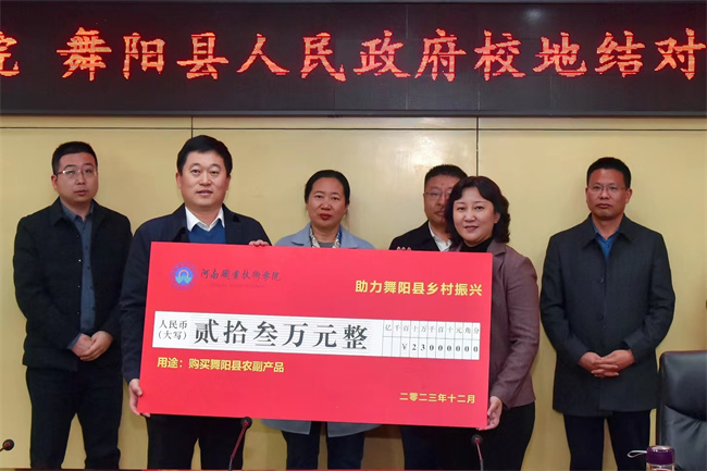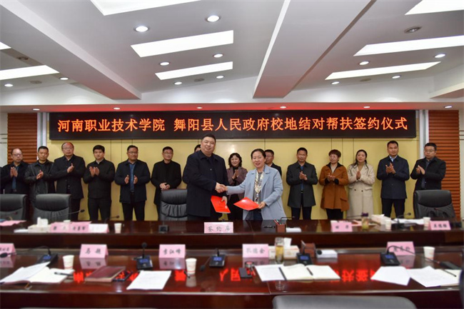 在簽約儀式上,夏新顏總結(jié)回顧了校地結(jié)對(duì)幫扶工作5年來(lái)所取得的成績(jī),介紹了學(xué)校今年在教育、文化、科技等方面的幫扶工作情況。夏新顏指出,校地結(jié)對(duì)幫扶是貫徹落實(shí)中央和省委關(guān)于脫貧攻堅(jiān)和鄉(xiāng)村振興工作戰(zhàn)略決策部署一項(xiàng)重要任務(wù)。5年來(lái),學(xué)校充分發(fā)揮人才、科技、智力、培訓(xùn)等方面的優(yōu)勢(shì),積極開(kāi)展校地結(jié)對(duì)幫扶舞陽(yáng)縣脫貧攻堅(jiān)、鄉(xiāng)村振興工作,幫扶工作取得豐碩成果。夏新顏希望雙方以此次簽約儀式為契機(jī),進(jìn)一步加強(qiáng)溝通協(xié)調(diào),完善長(zhǎng)效合作機(jī)制,為舞陽(yáng)縣各項(xiàng)事業(yè)的發(fā)展貢獻(xiàn)河職力量?椎掠鄬(duì)學(xué)校多年來(lái)給予舞陽(yáng)的大力支持和幫扶表示感謝,并希望學(xué)校繼續(xù)發(fā)揮國(guó)家“雙高計(jì)劃”建設(shè)院校優(yōu)勢(shì),加強(qiáng)在人才、培訓(xùn)、科技、教育和文化等方面的幫扶,進(jìn)一步深化雙方結(jié)對(duì)幫扶成果,推動(dòng)舞陽(yáng)縣鄉(xiāng)村振興和經(jīng)濟(jì)社會(huì)高質(zhì)量發(fā)展。隨后,夏新顏與孔德余交接了消費(fèi)幫扶牌匾,田華與李曉勇簽署了校地幫扶鄉(xiāng)村振興框架協(xié)議。