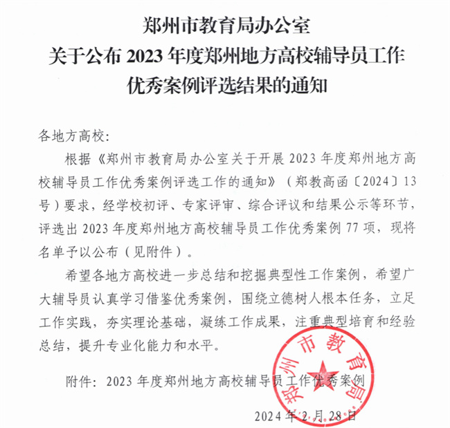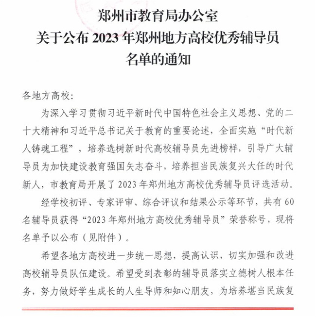 中新河南網(wǎng)3月11日電(韓園) 近日,根據(jù)鄭州市教育局辦公室發(fā)布的《關(guān)于公布2023年度鄭州地方高校輔導(dǎo)員工作優(yōu)秀案例評選結(jié)果的通知》(鄭教高函﹝2024﹞126號)、《關(guān)于公布2023年鄭州地方高校優(yōu)秀輔導(dǎo)員名單的通知》(鄭教高函﹝2024﹞127號)文件。鄭州軟件職業(yè)技術(shù)學(xué)院老師李田文榮獲“2023年度鄭州地方高校優(yōu)秀輔導(dǎo)員”稱號;蕩涱I(lǐng)申報(bào)的案例《褪去“功利”,沖當(dāng)先鋒》、葉海月申報(bào)的案例《護(hù)航心理健康 引領(lǐng)學(xué)業(yè)成長》成功入選2023年鄭州地方高校輔導(dǎo)員工作優(yōu)秀案例。