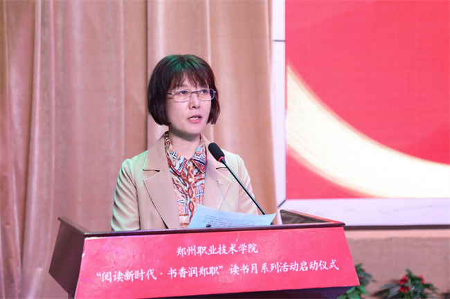工會主席王桂麗宣讀《鄭州職業(yè)技術學院“閱讀新時代·書香潤鄭職”讀書月系列活動通知》。
