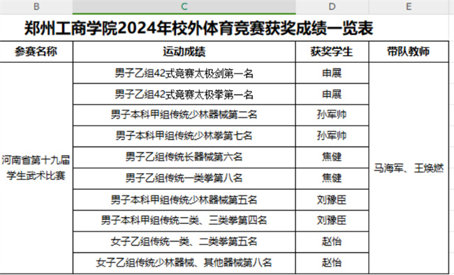 本屆比賽吸引了來自省內(nèi)80所高校、近千余名運(yùn)動員和教練員參賽,是省內(nèi)高校間級別最高、規(guī)模最大、影響力最廣的武術(shù)賽事。在校領(lǐng)導(dǎo)和學(xué)院的關(guān)懷與支持下,鄭州工商學(xué)院武術(shù)代表隊(duì)選派6名運(yùn)動員,在馬海軍、王煥燃老師的帶領(lǐng)下,分別參加了12個(gè)單項(xiàng)比賽,共獲獎十項(xiàng)。比賽中,運(yùn)動員們用頑強(qiáng)拼搏的精神、高超的技術(shù),展示了該校學(xué)子健康自信、團(tuán)結(jié)向上的陽光形象,為該校樹立了良好的口碑、贏得了贊譽(yù)。