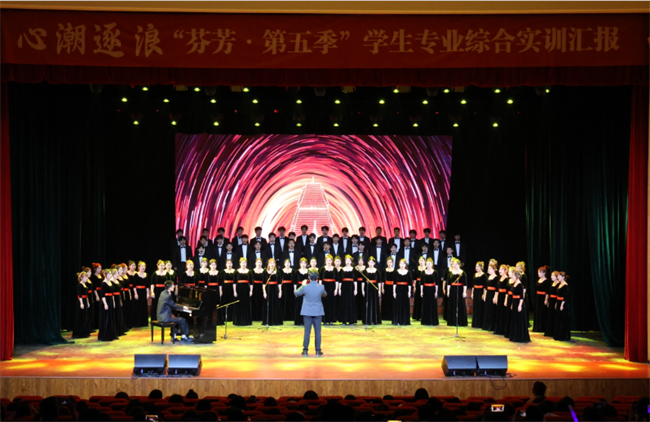 《逐浪》是改革開放之潮。這一時期,學(xué)校親歷了改革開放的蓬勃,數(shù)易校名,卻不墜育人之志,不改育人初心。在新征程上,高擎師范教育大旗,桃李千枝競放,蘭蕙萬里飄香。舞蹈《阿噶人》、器樂合奏《青春舞曲》、情景歌舞《錯位時空》讓觀眾跟隨演員一起打開了記憶的的時光相冊,為現(xiàn)代青年指引奮斗方向!镀评恕肥敲褡鍙(fù)興的之潮。演員們用朗誦《奮楫揚帆逐浪行》歌頌校史,用歌舞《夢想的遠(yuǎn)征》展望未來,用合唱《追尋》表達(dá)追求。在職業(yè)教育的新賽道上,文職院的新時代青年必將積歷史之厚蘊,創(chuàng)今朝之輝煌。