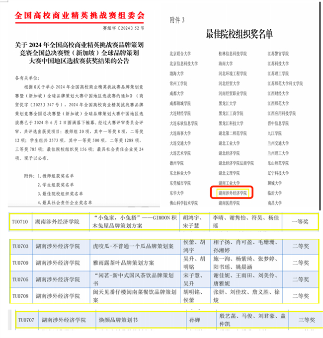 中新河南網(wǎng)6月5日電 6月2日,第十二屆全國高校商業(yè)精英挑戰(zhàn)賽品牌策劃競賽全國總決賽落下帷幕。湖南涉外經(jīng)濟(jì)學(xué)院選派的學(xué)子在全國總決賽2573余支隊(duì)伍中脫穎而出,榮獲全國一等獎(jiǎng)1項(xiàng),全國二等獎(jiǎng)4項(xiàng),全國三等獎(jiǎng)1項(xiàng),同時(shí)該校榮獲最佳院校組織獎(jiǎng)。獲獎(jiǎng)作品分別有:李晴、謝雋怡、符昊、楊佳瑤的作品《“小兔家,小兔搭”—GIMOON積木兔屋品牌策劃方案》(全國一等獎(jiǎng));相子揚(yáng)、肖可盈、毛珊珊、孫湘婷的作品《虎咬瓜-不普通一個(gè)瓜品牌策劃案》(全國二等獎(jiǎng));施一洵、楊紫琦、張夢(mèng)婷、陽書瑤、姚晨涵的作品《雅雨露茶葉品牌策劃方案》(全國二等獎(jiǎng));謝佳妮、王雨田、劉美伶、唐雅妮的作品《閑茗-新中式國風(fēng)茶飲品牌策劃書》(全國二等獎(jiǎng));張妍、劉佳玟、詹義勝、徐焌的作品《閩天見番仔樓閩南菜餐飲品牌策劃案》(全國二等獎(jiǎng));殷藝菡、馬俊、劉君豪、蓋仲凱的作品《煥顏品牌策劃書》(全國三等獎(jiǎng))。