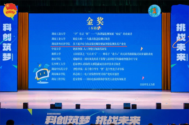 中新河南網(wǎng)6月26日電 6月21日至24日,第十一屆“挑戰(zhàn)杯”湖南省大學(xué)生創(chuàng)業(yè)計(jì)劃競(jìng)賽終審決賽在湖南信息學(xué)院舉行。由湖南涉外經(jīng)濟(jì)學(xué)院信息與機(jī)電工程學(xué)院陳繼鋒院長、劉紅華教授、陳蘭鑫老師指導(dǎo),項(xiàng)目負(fù)責(zé)人邵政熙,團(tuán)隊(duì)成員劉清琪、馬李洋、魏爽等同學(xué)共同完成的《基于超聲應(yīng)力的高強(qiáng)度螺栓健康智能監(jiān)測(cè)及其產(chǎn)業(yè)化》項(xiàng)目榮獲該賽事本科組金獎(jiǎng),是該校在該賽事上首次實(shí)現(xiàn)省級(jí)金獎(jiǎng)的突破。此外,該校《紅色研學(xué)助力彭德懷故里金色發(fā)展》項(xiàng)目、《明志書屋——打造面向未來的鄉(xiāng)村智慧教育空間》項(xiàng)目、《綠色“塑”造——無污染可降解塑料創(chuàng)新者》項(xiàng)目、《銀色記事館——記錄“老英雄”傳奇的人生》項(xiàng)目在本次大賽上同樣獲得了省級(jí)銅獎(jiǎng)的好成績。
