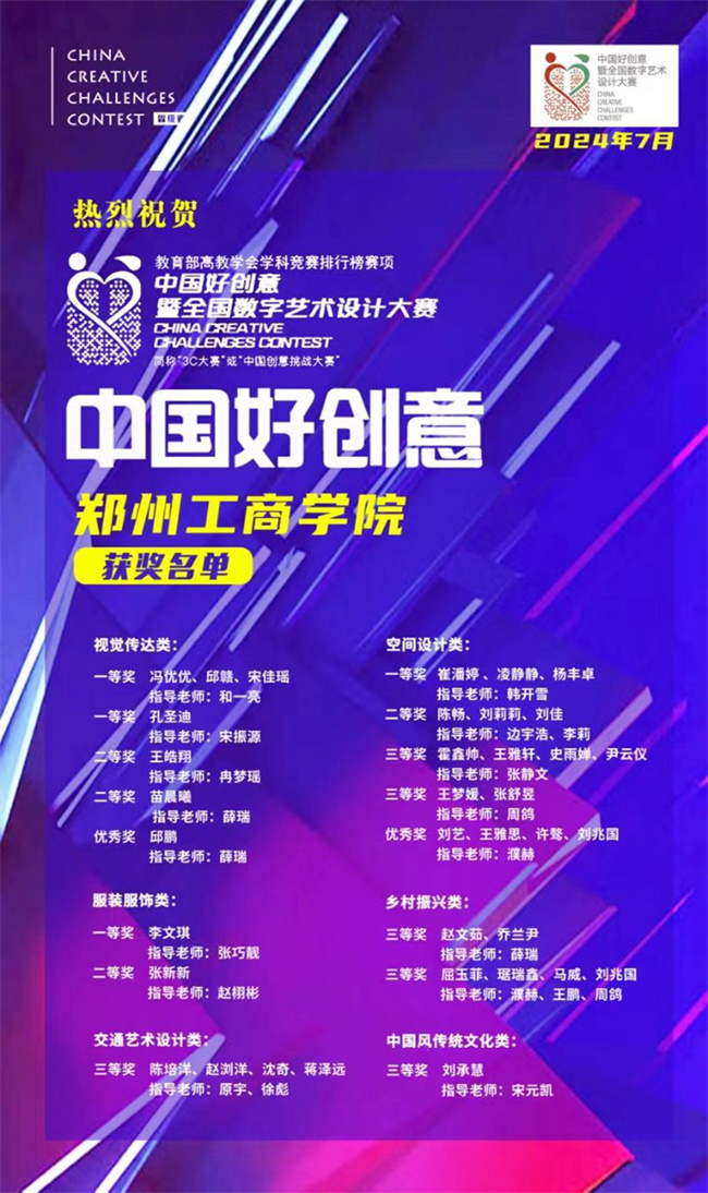 中國好創(chuàng)意暨全國數(shù)字藝術(shù)設(shè)計大賽是入選教育部中國高等教育學(xué)會發(fā)布的《全國普通高校學(xué)科競賽排行榜》賽項,是我國跨學(xué)科、多專業(yè)、影響廣泛的權(quán)威賽事。自賽訊發(fā)布以來,鄭州工商學(xué)院藝術(shù)學(xué)院高度重視此項競賽,秉承“以賽促學(xué)、以賽促教”的育人理念,統(tǒng)籌安排、廣泛宣傳動員學(xué)生參賽,以專業(yè)競賽為牽引,著力提升學(xué)生創(chuàng)新能力。
