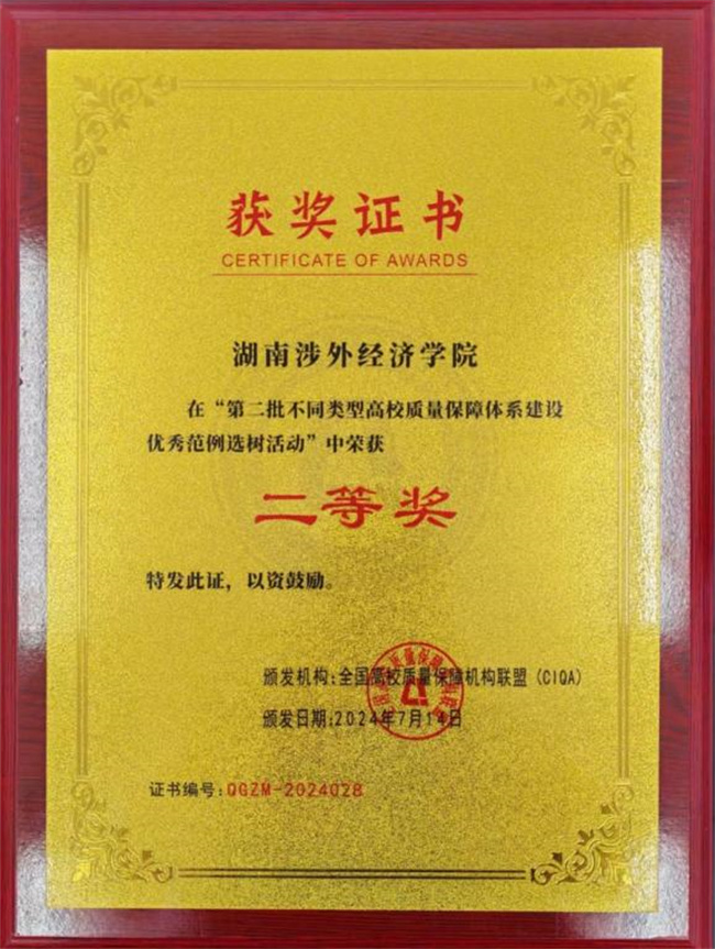 湖南涉外經濟學院榮獲全國“第二批不同類型高校質量保障體系建設優(yōu)秀范例選樹活動”二