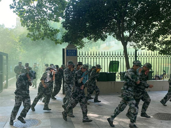 軍訓(xùn)教官在學(xué)生宿舍樓投放消防演習(xí)發(fā)煙罐模擬火情,一時(shí)濃煙四起。隨后消防警報(bào)聲響起,本次應(yīng)急疏散逃生演練也拉開了序幕,同學(xué)們拿起濕毛巾,捂住口鼻,彎腰,在充滿煙霧的緊張環(huán)境中按照消防通道路線,有序、快速向指定地點(diǎn)進(jìn)行疏散。到達(dá)集合地點(diǎn)后,教官們迅速清點(diǎn)班級人數(shù),確保全部學(xué)生都及時(shí)撤離、無掉隊(duì)。